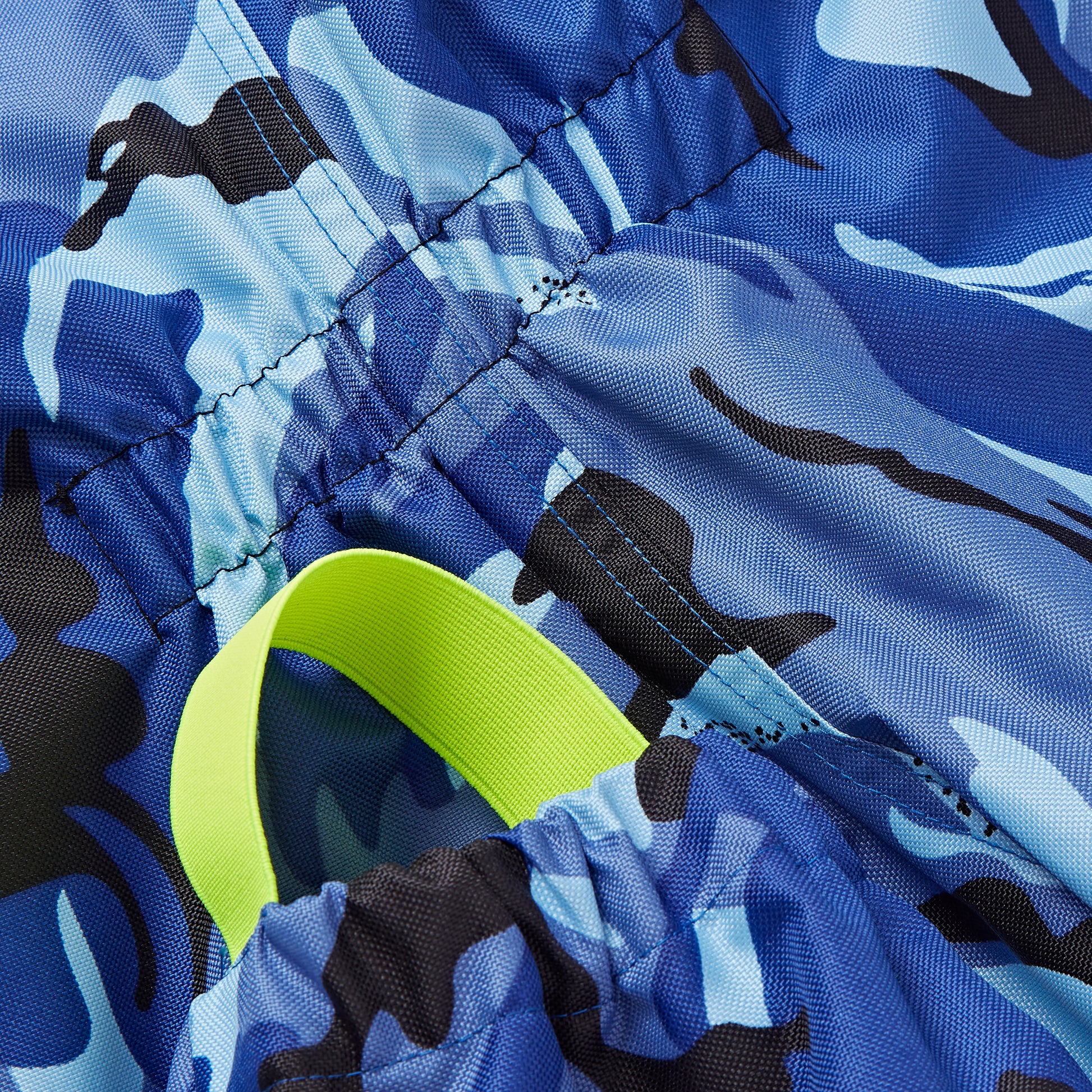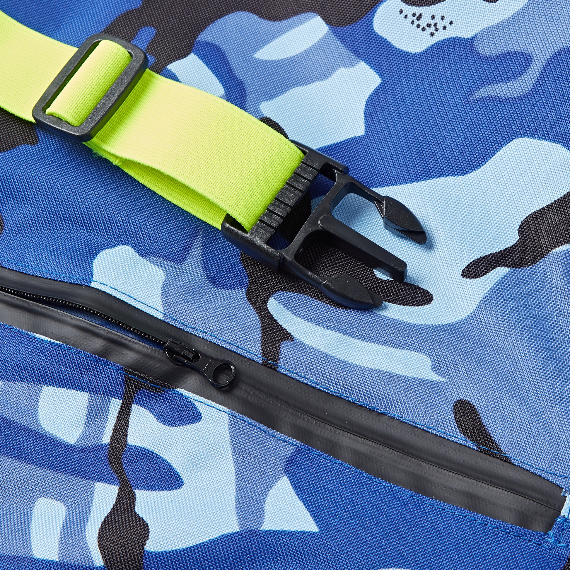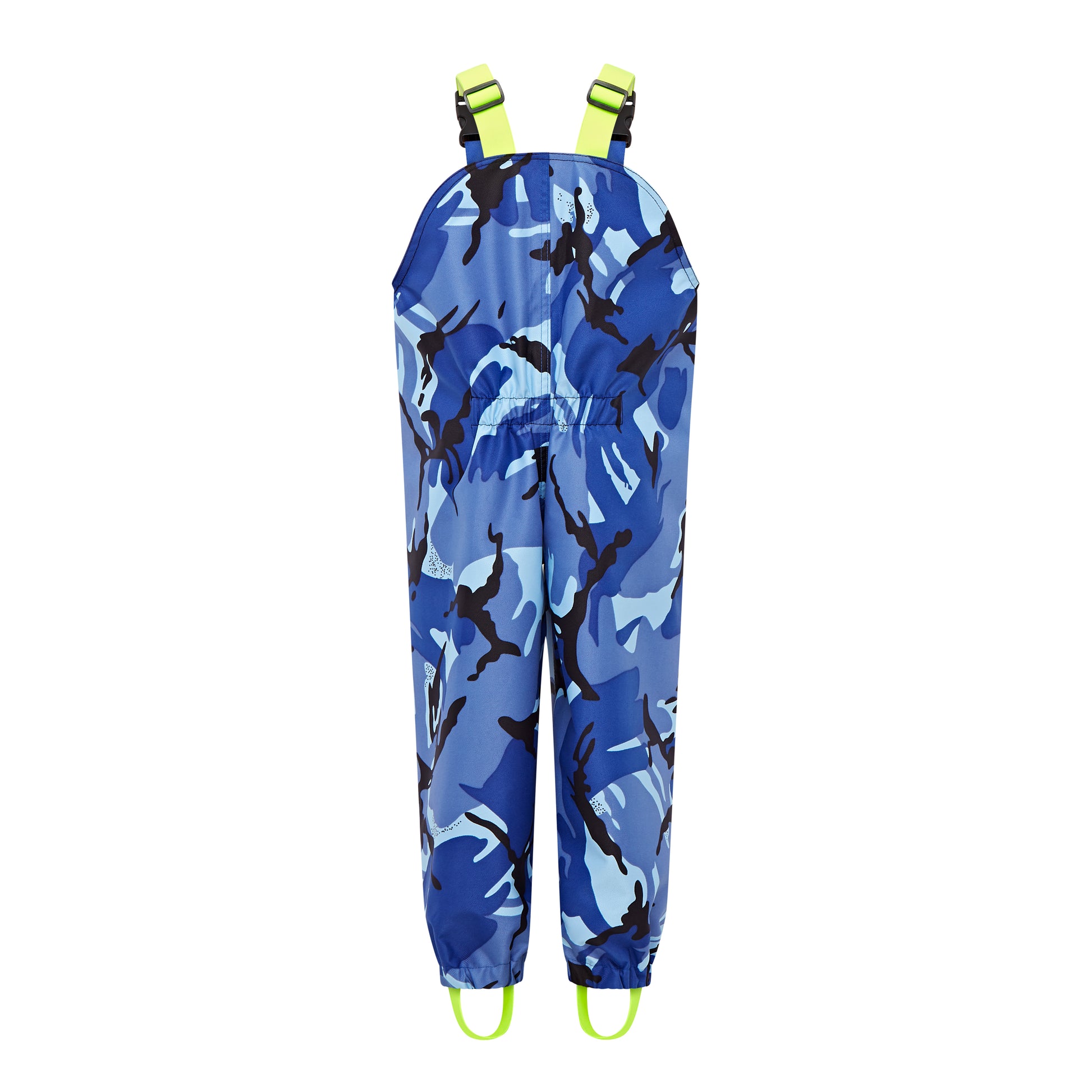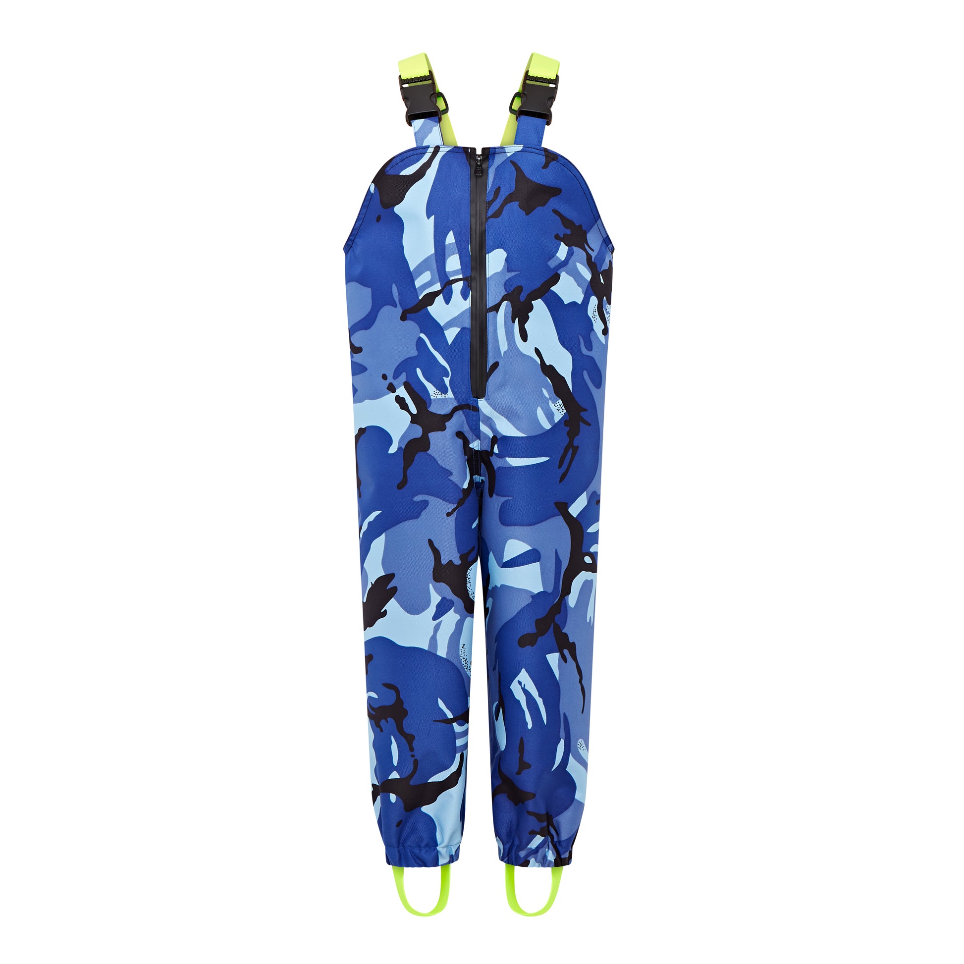 Blue Camo print body with Neon Yellow adjustable elastic straps & stirrups. Fully taped front zip for taking on and off with ease.